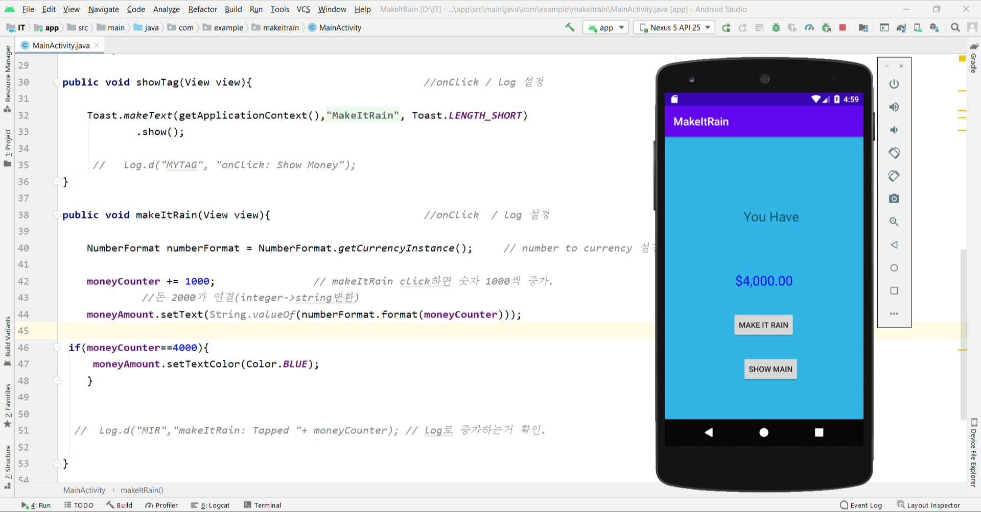 public class MainActivity extends AppCompatActivity { //makeItRain click시 돈숫자 증가.