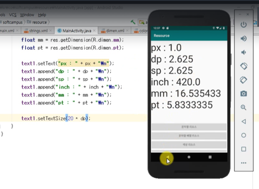 text1.setTextSize(20 * dp); // 텍스트 사이즈