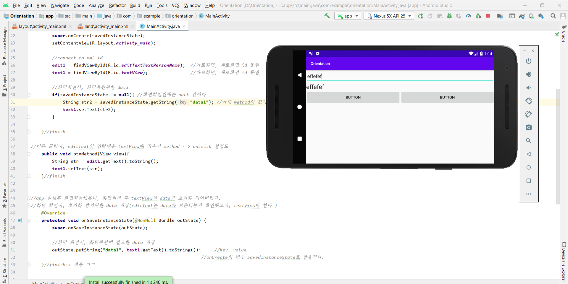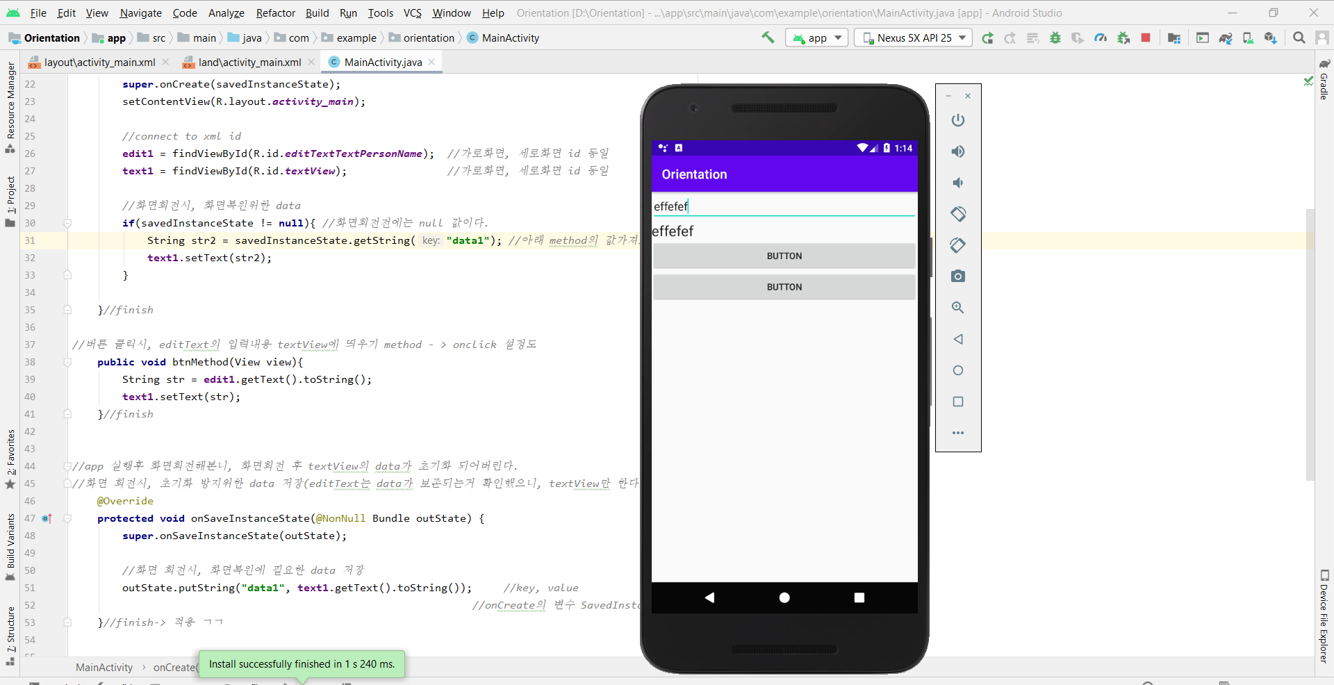 //세로, 가로 화면 각각 화면설정했음. - 각 화면의 editText, textView의 id는 같게 해야 코딩 편하다.
