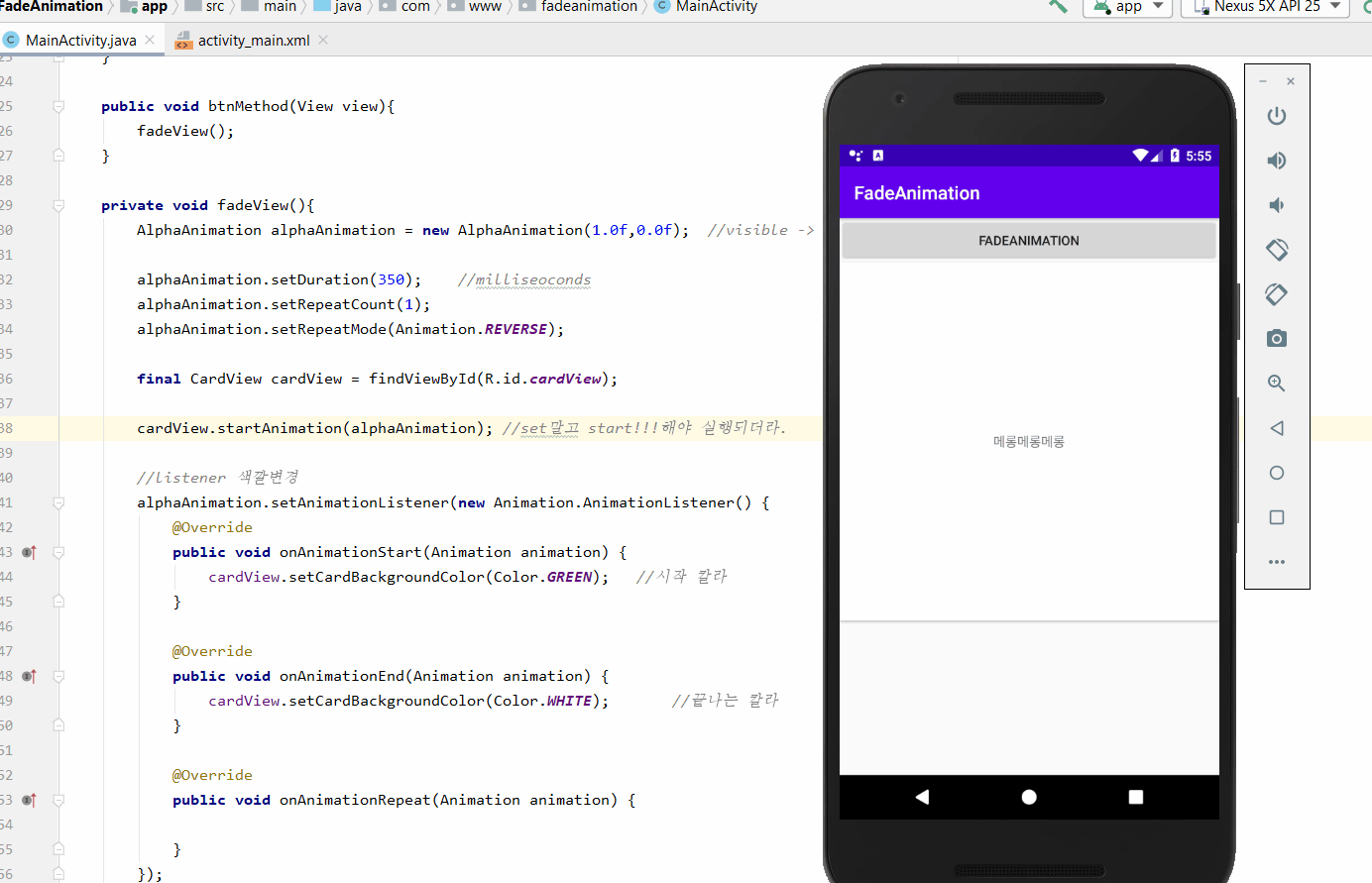 cardView.startAnimation(alphaAnimation); //set말고 start!!!해야 실행되더라.