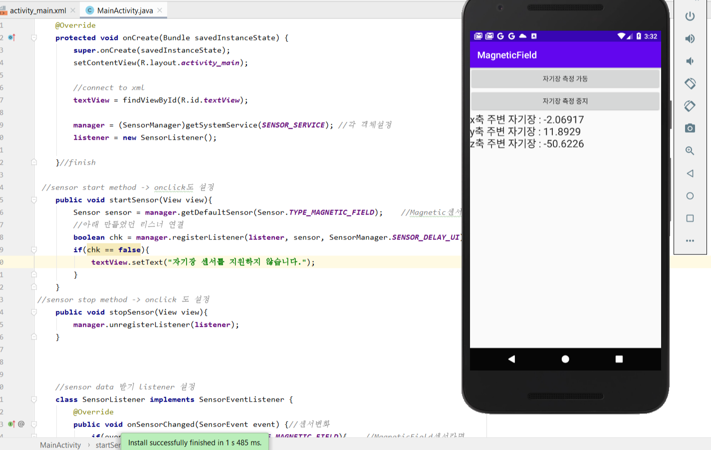 센서 data 받아오기 listener : 센서listener다들 비슷함. Type을 MAGNETIC으로 설정.