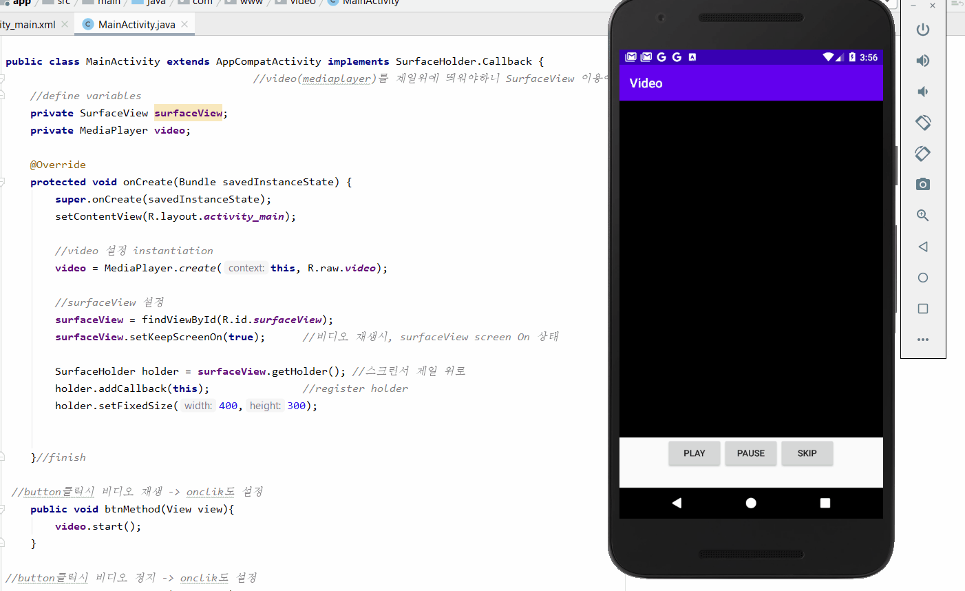 // surfaceView 나옴과 동시에 비디오도 바로 재생됨.(버튼안누르고)