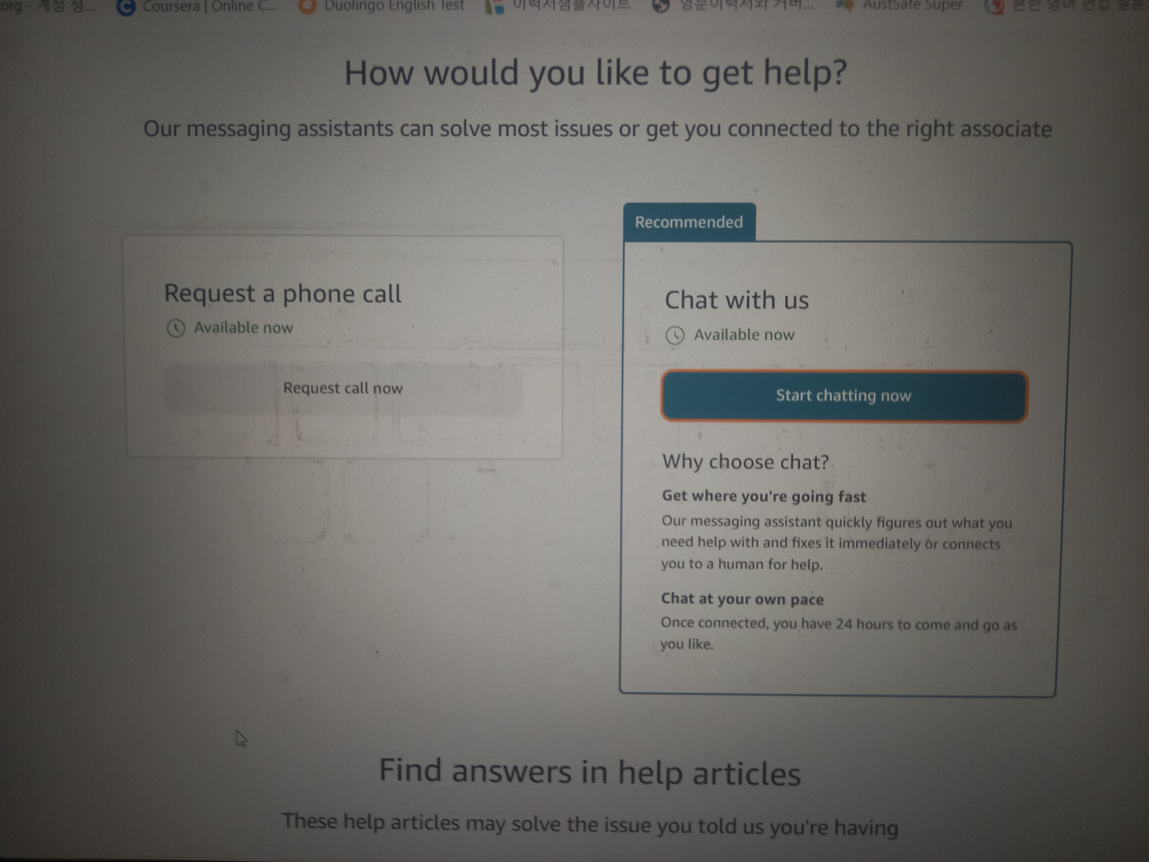 미국 아마존 홈페이지에 들어가서 웹사이트 하단에 help 를 누르고 계정관련이슈로 들어가다보면 아래와같은 페이지를 만날 수 있습니다.