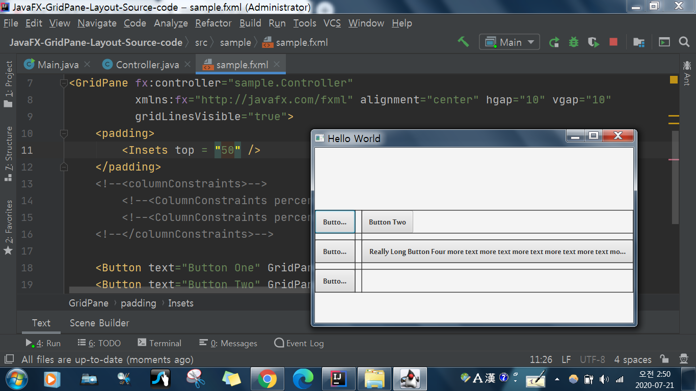 <Button text="Really Long Button Four " GridPane.rowIndex="1" GridPane.columnIndex="1"/>