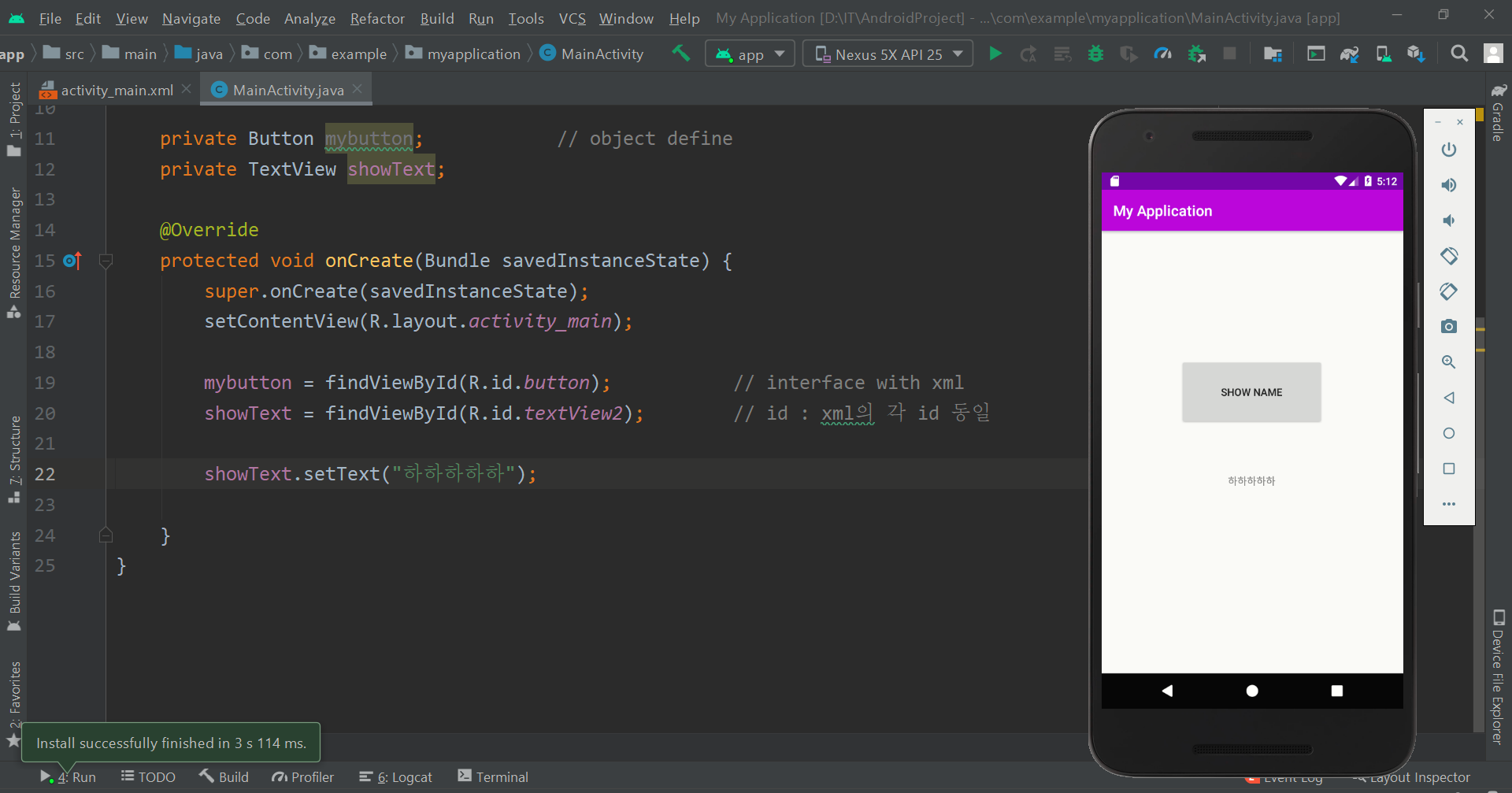 showText = findViewById(R.id.textView2); // id : xml의 각 id 동일 V