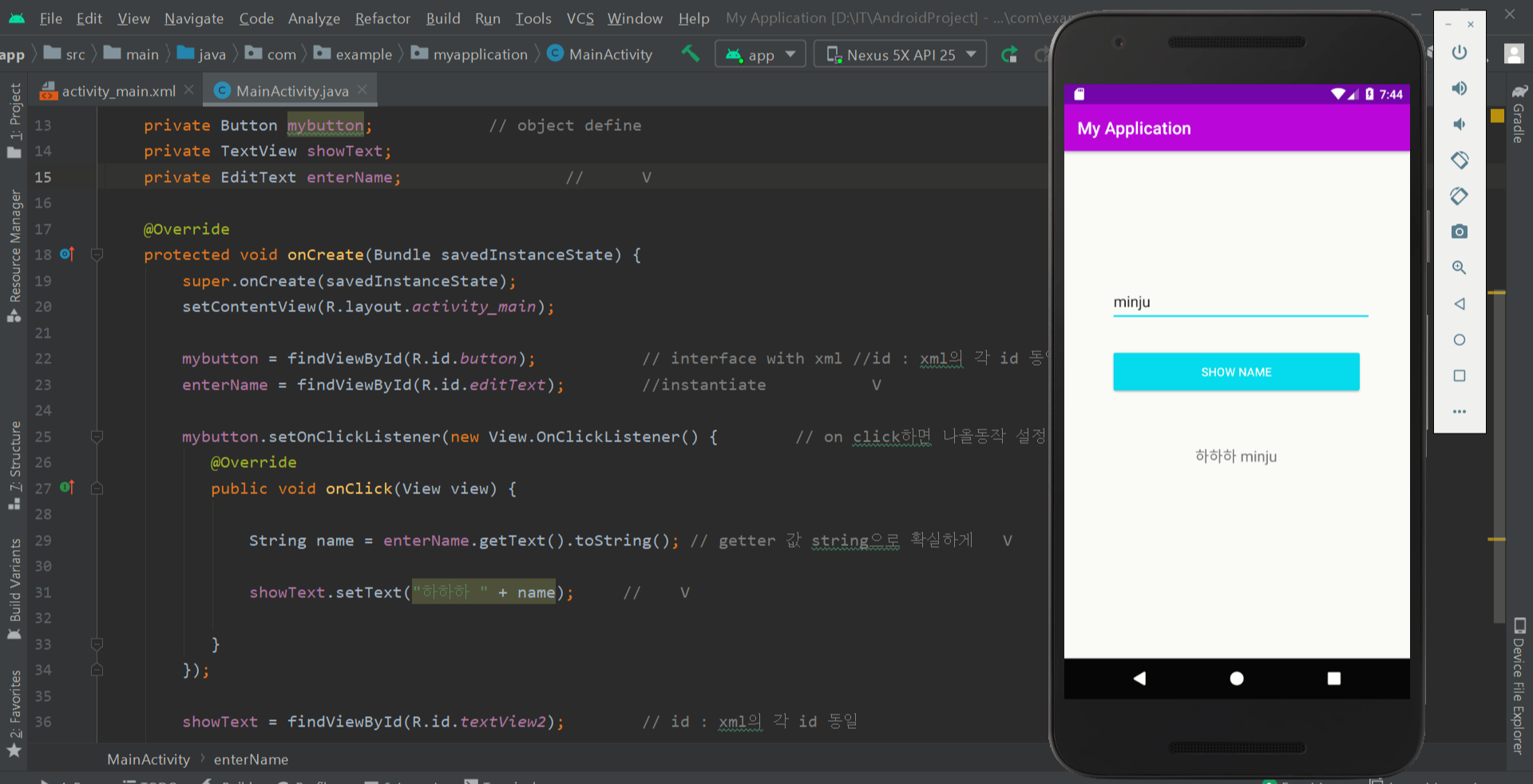 showText = findViewById(R.id.textView2); // id : xml의 각 id 동일