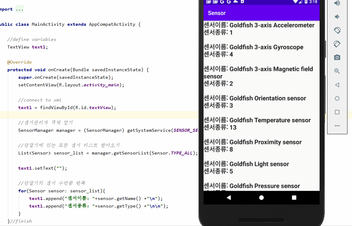 안드로이드 스튜디오 센서 기초 코딩. 센서목록 띄우기.
